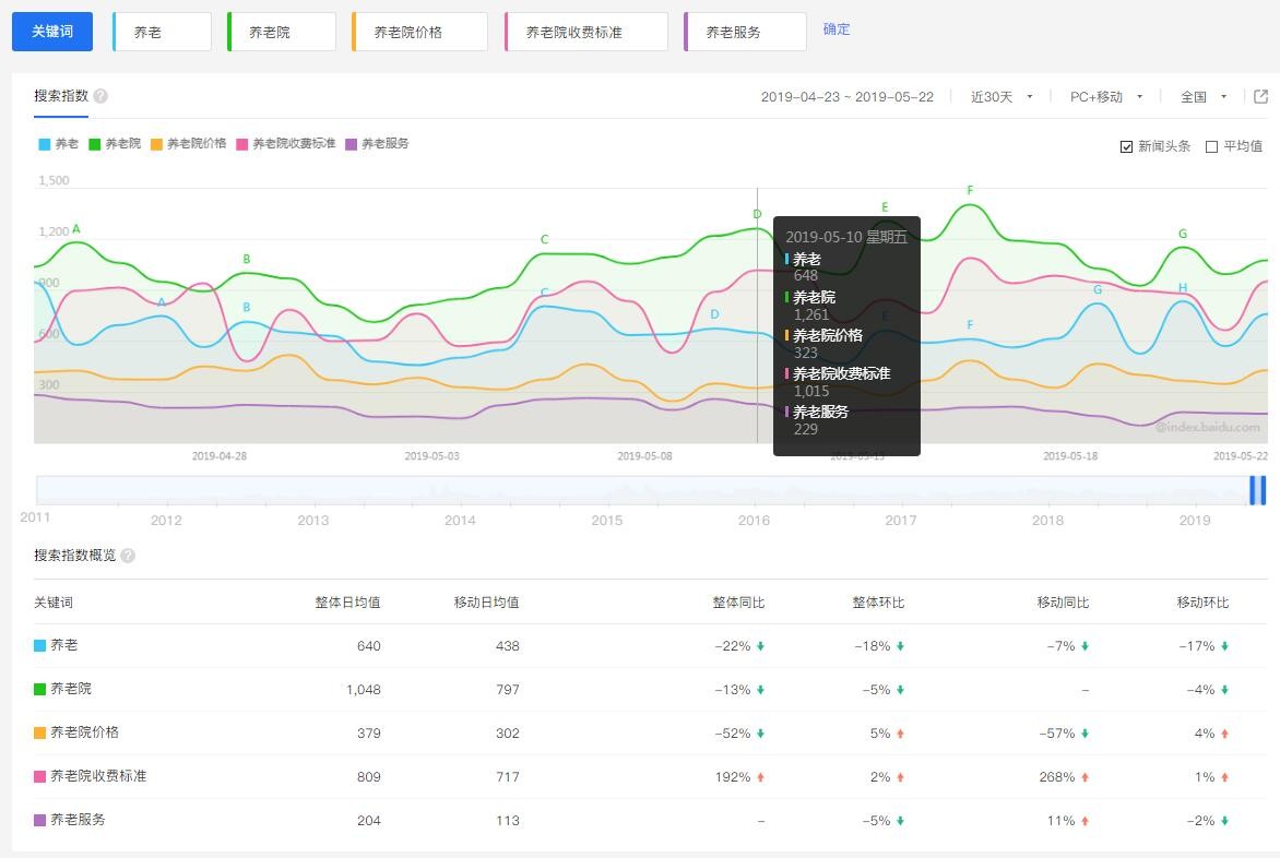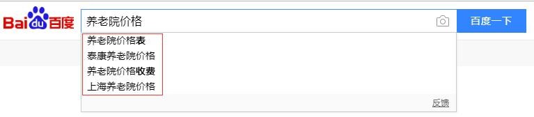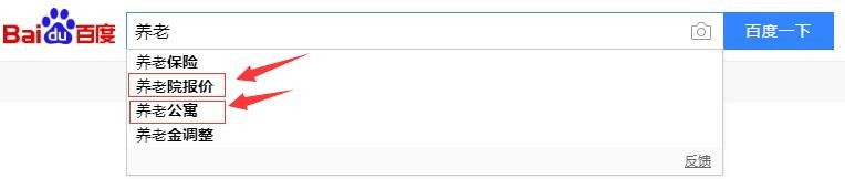 如下图:百度搜索框输入“养老” 只有“养老院报价”和“养老公寓”更有价值,转化更高。